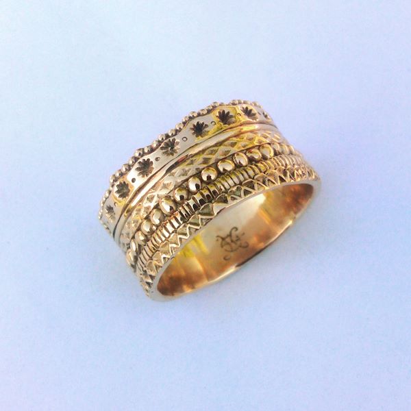 « Ces boucles d'oreilles épaisses en bronze jaune sont d'inspiration barbare. Leur design géométrique abstrait avec bordure hachurée et demi-boules aux coins du losange correspond de près aux motifs récurrents des bijoux germaniques du début de notre ère. Elles portent le nom d'Arégundis en hommage à cette reine franque dont on a découvert la sépulture garnie de ses parures. »