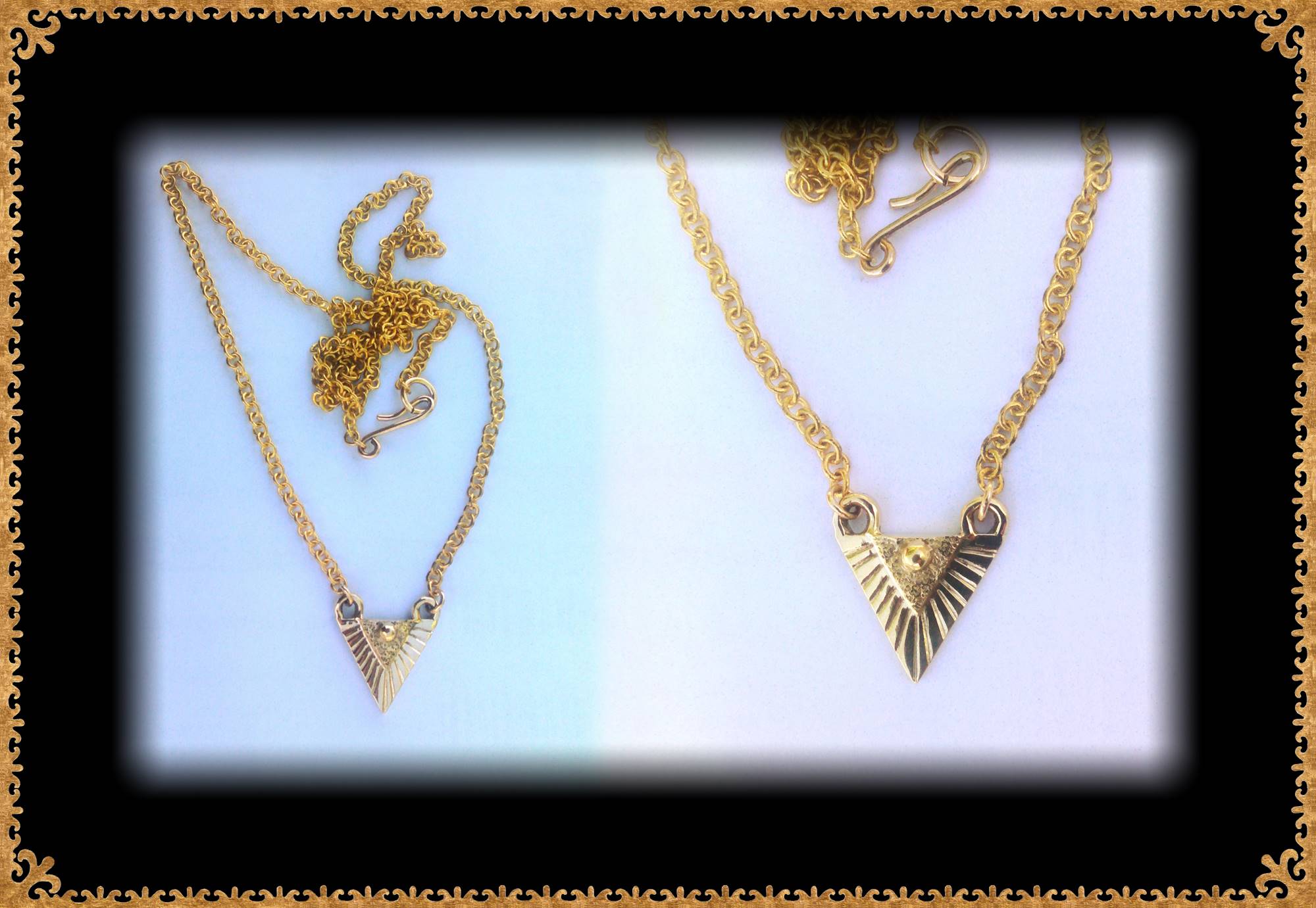 « Cecollier est composé d'un petit motif triangulaire en bronze jaune, monté sur chaîne en laiton.