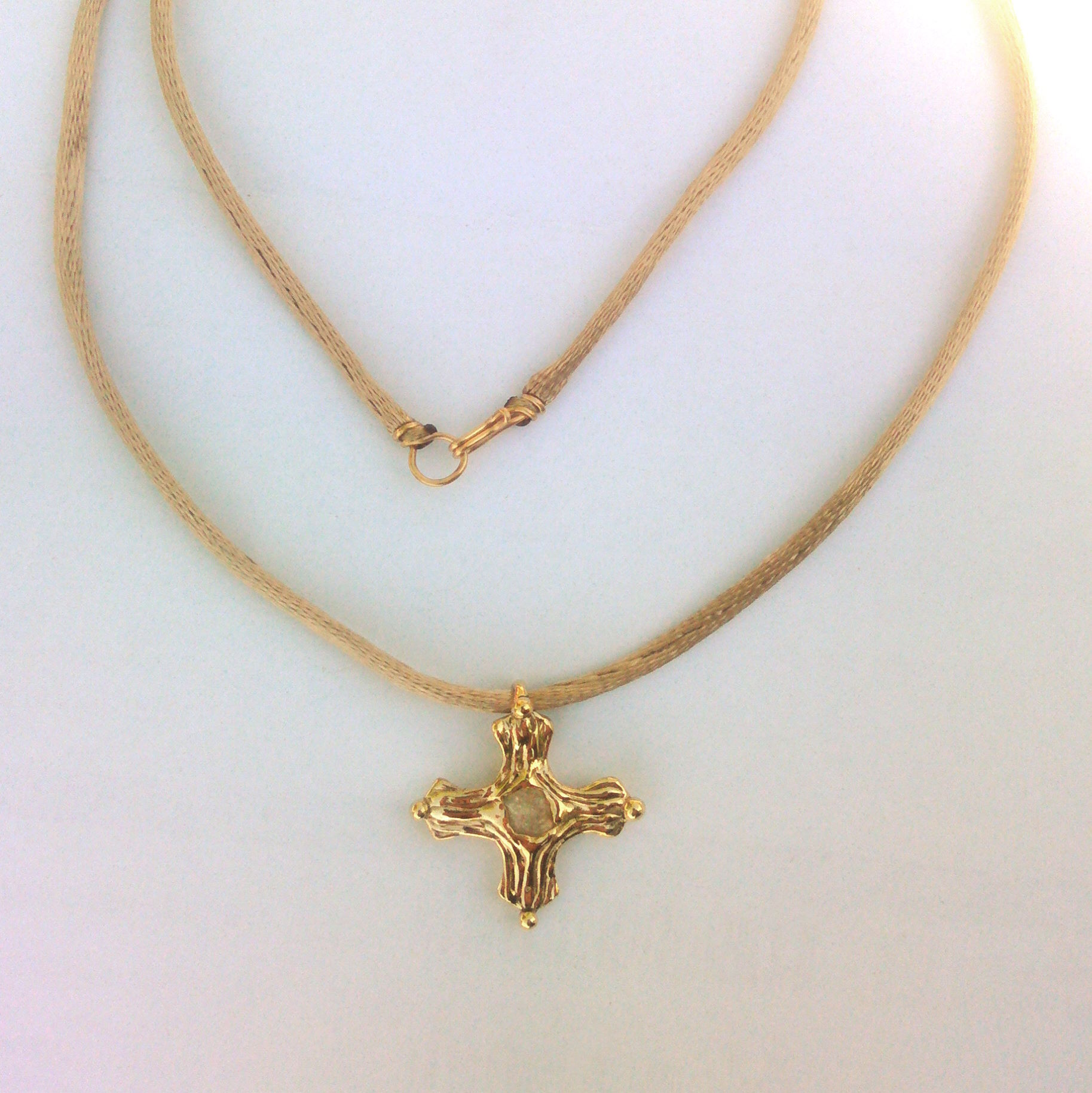 Croix grecque montée en pendentif sur cordon beige. Le centre de la croix contient une petite pierre brute blanche légèrement brillante.
