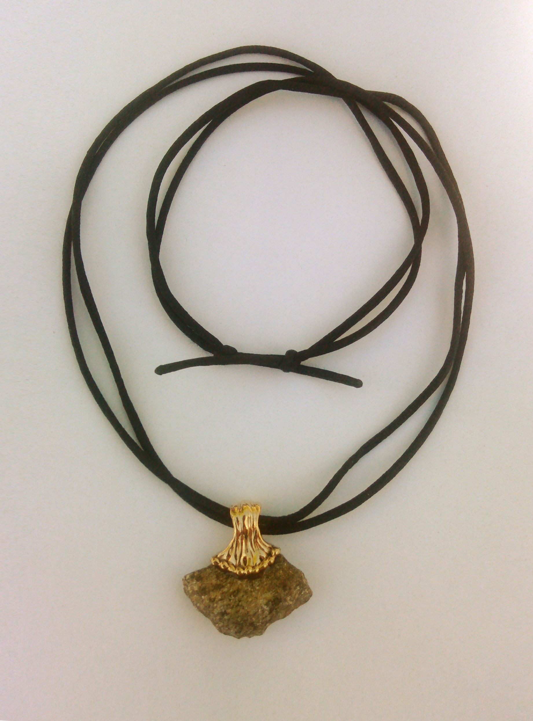 Pierre brute montée sur bélière ornementale en bronze jaune, en pendentif sur cordon noir. Cette pierre non précieuse provient d'une rivière auvergnate, elle est grise et légèrement brillante grâce aux paillettes de mica qu'elle contient.