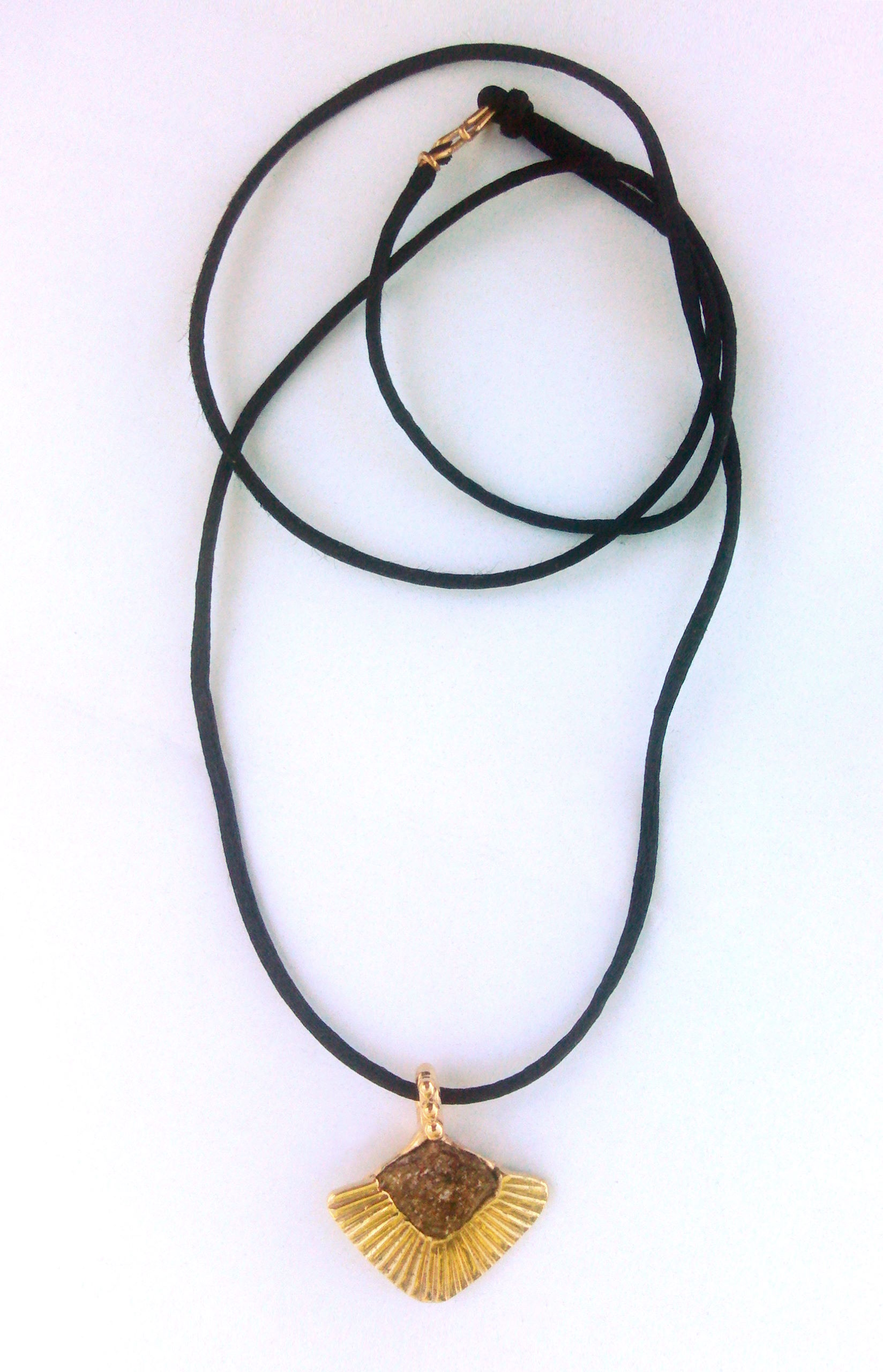 Pendentif en bronze jaune avec pierre brute sertie, montée sur cordon noir. Cette pierre non précieuse provient d'une rivière auvergnate, elle est rosée et légèrement brillante grâce aux paillettes de mica qu'elle contient.