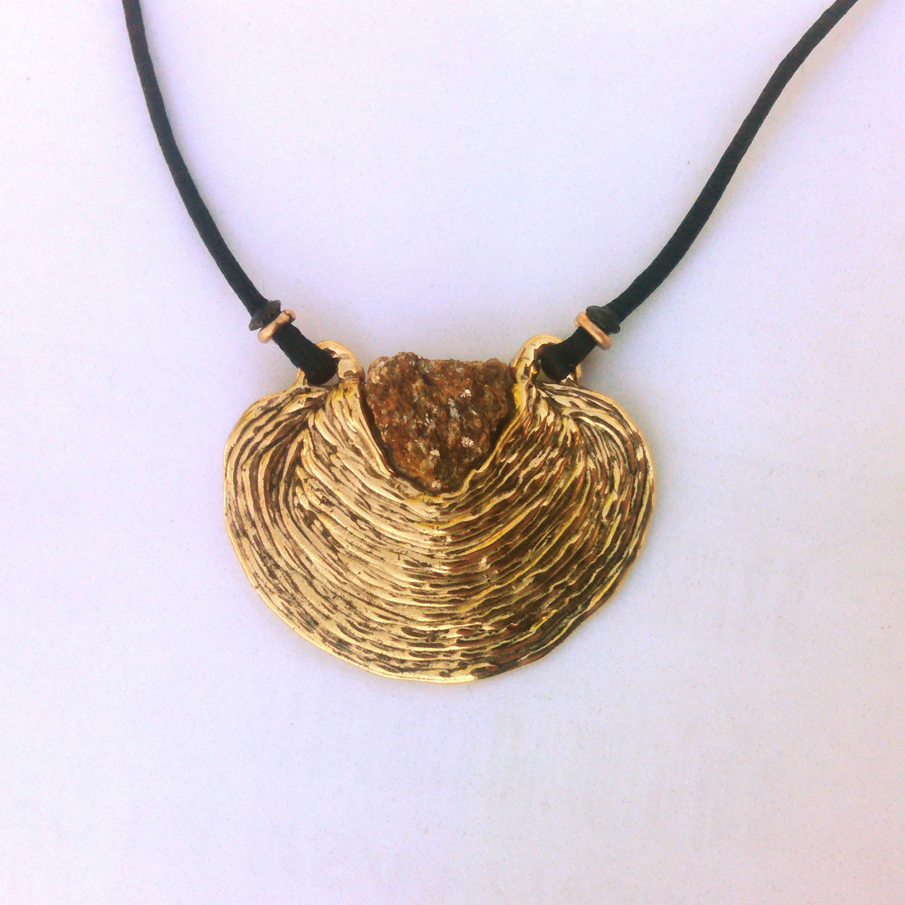 Pierre brute entourée d'un grand motif arrondi en bronze jaune, montée sur cordon noir. Cette pierre non précieuse provient d'une rivière auvergnate, elle est gris-rosé et légèrement brillante grâce aux paillettes de mica qu'elle contient.