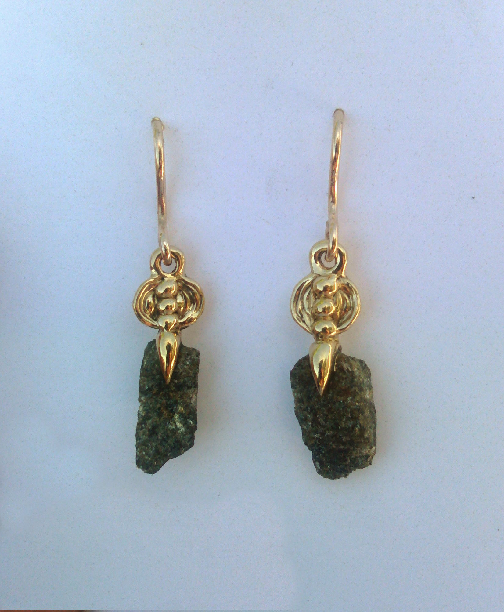 Pierres brutes montées en boucles d'oreilles sur un motif en bronze jaune. Ces pierres non précieuses proviennent d'une rivière auvergnate. De couleur gris foncé, elles sont aussi légèrement brillantes.
