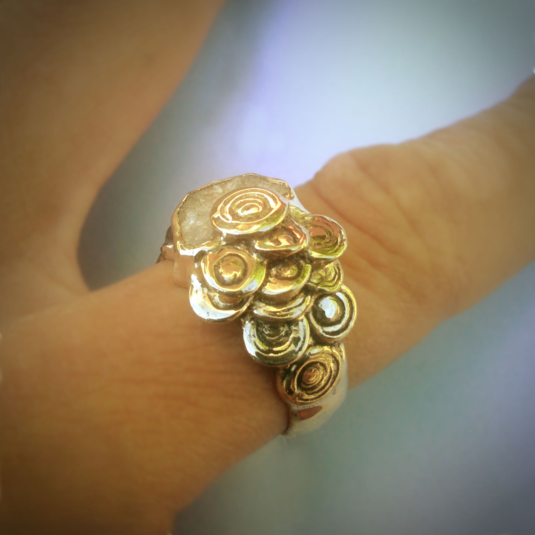 Sur cette bague en bronze jaune est sertie une pierre brute, en forme de demie-lune. La pierre (non précieuse) est blanche et légèrement brillante. Assymétrique, la bague est formée par des petits éléments ronds amassés sur un côté, tandis que le métal semble couler de l'autre côté.