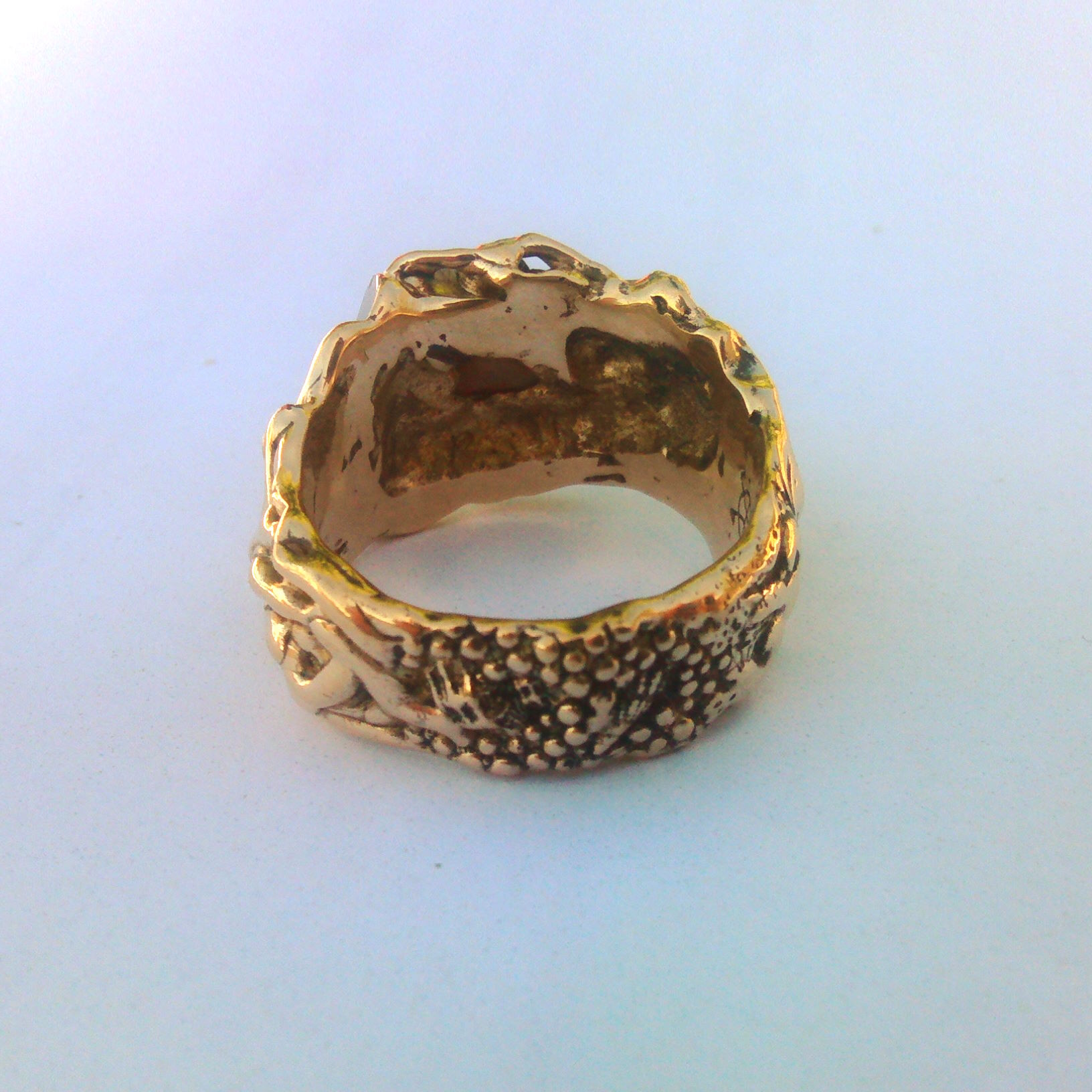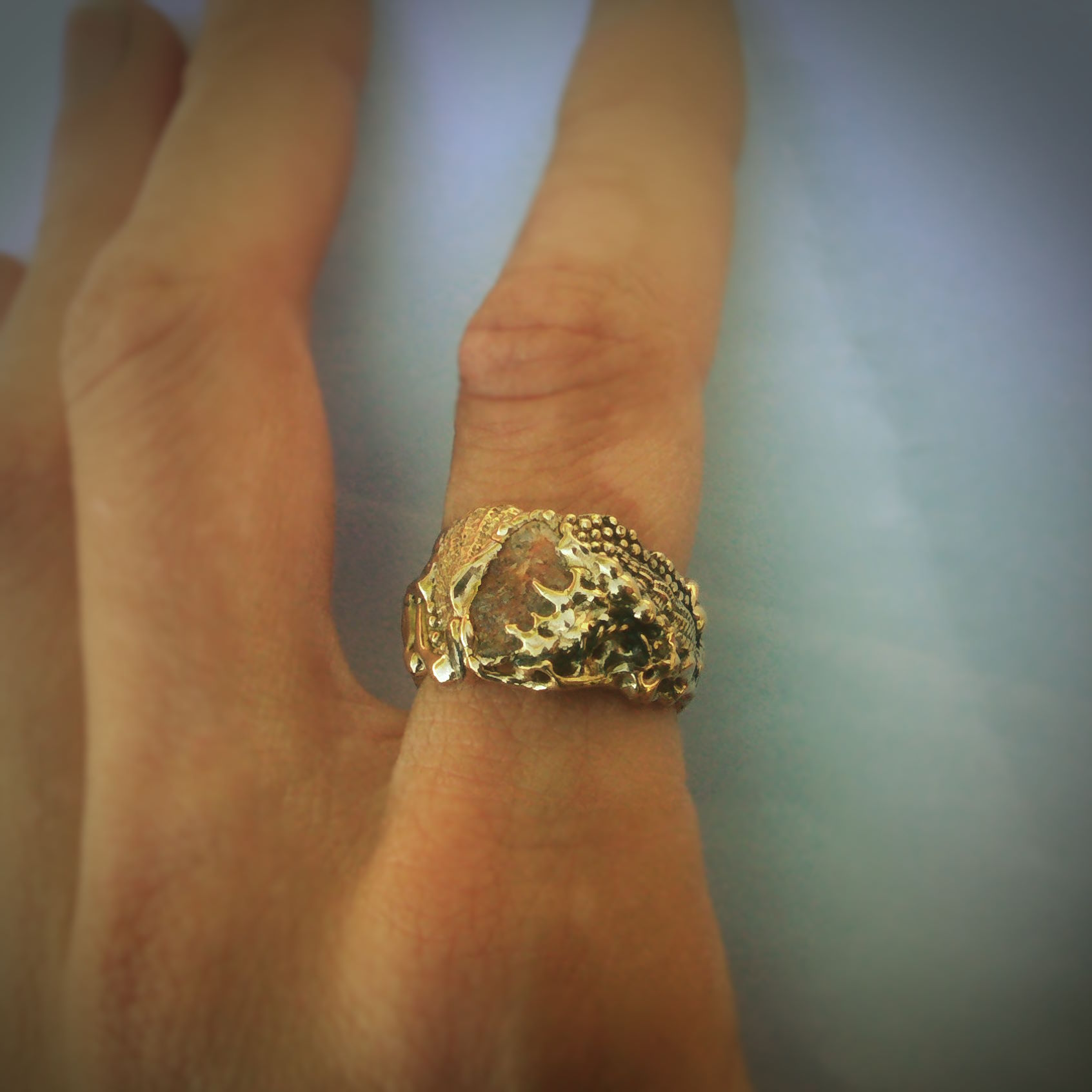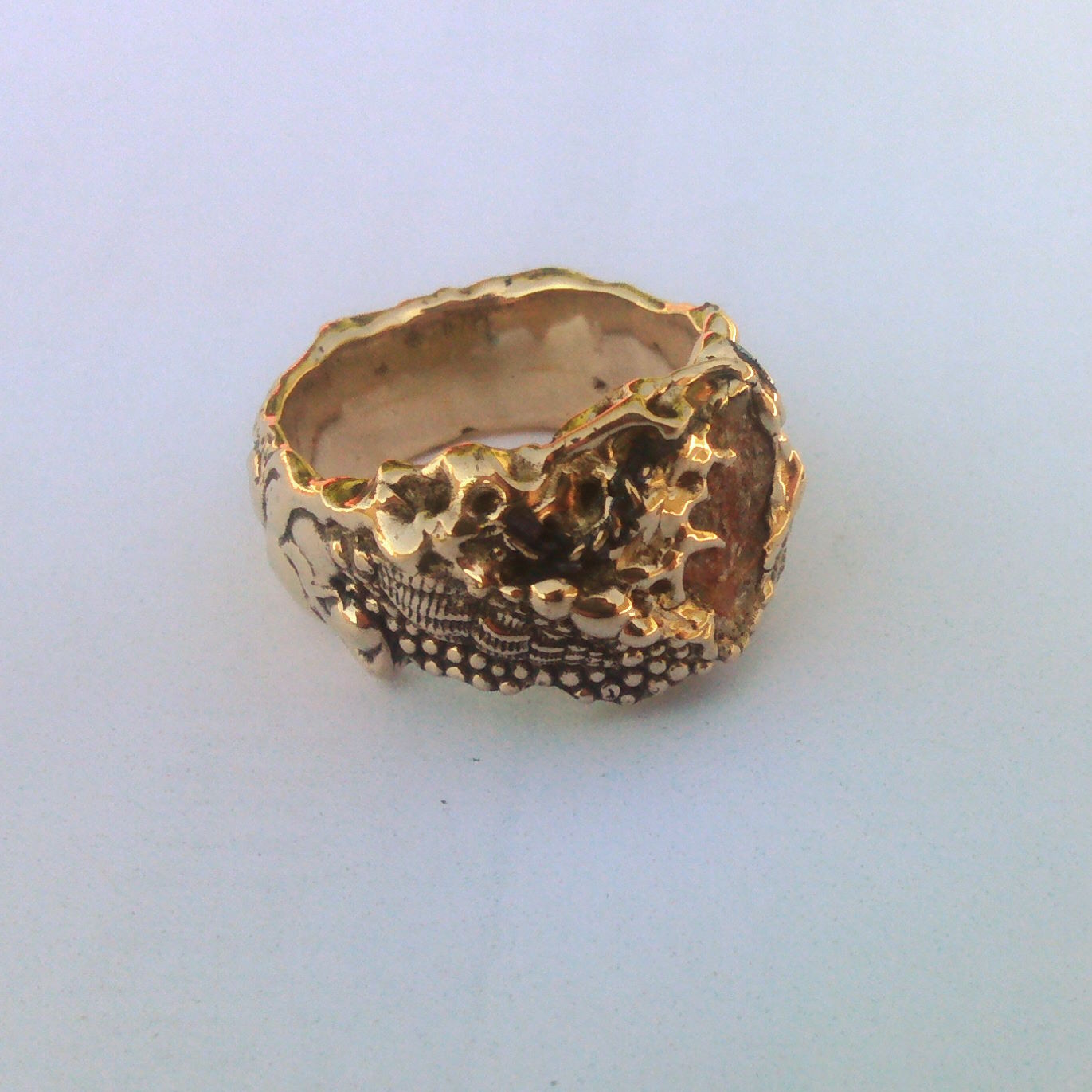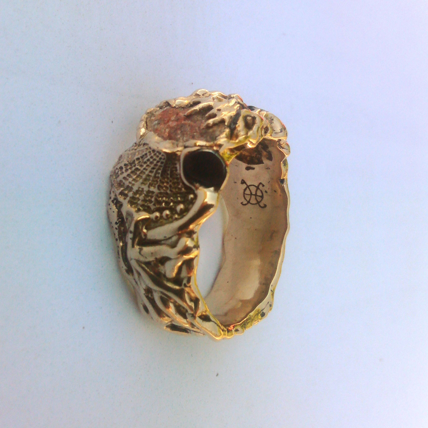 Sur cette bague en bronze jaune est sertie une pierre brute (non précieuse), couleur rouge brique légèrement brillante. Assymétrique, la bague présente de multiples motifs tels que des coquillages, billes, entrelacs, vaguelettes... Quelques petits éléments étrangers y sont également incrustés (chaînette et clou). Cette composition hétéroclite suggère des fonds marins remplis de trésors enfouis.
