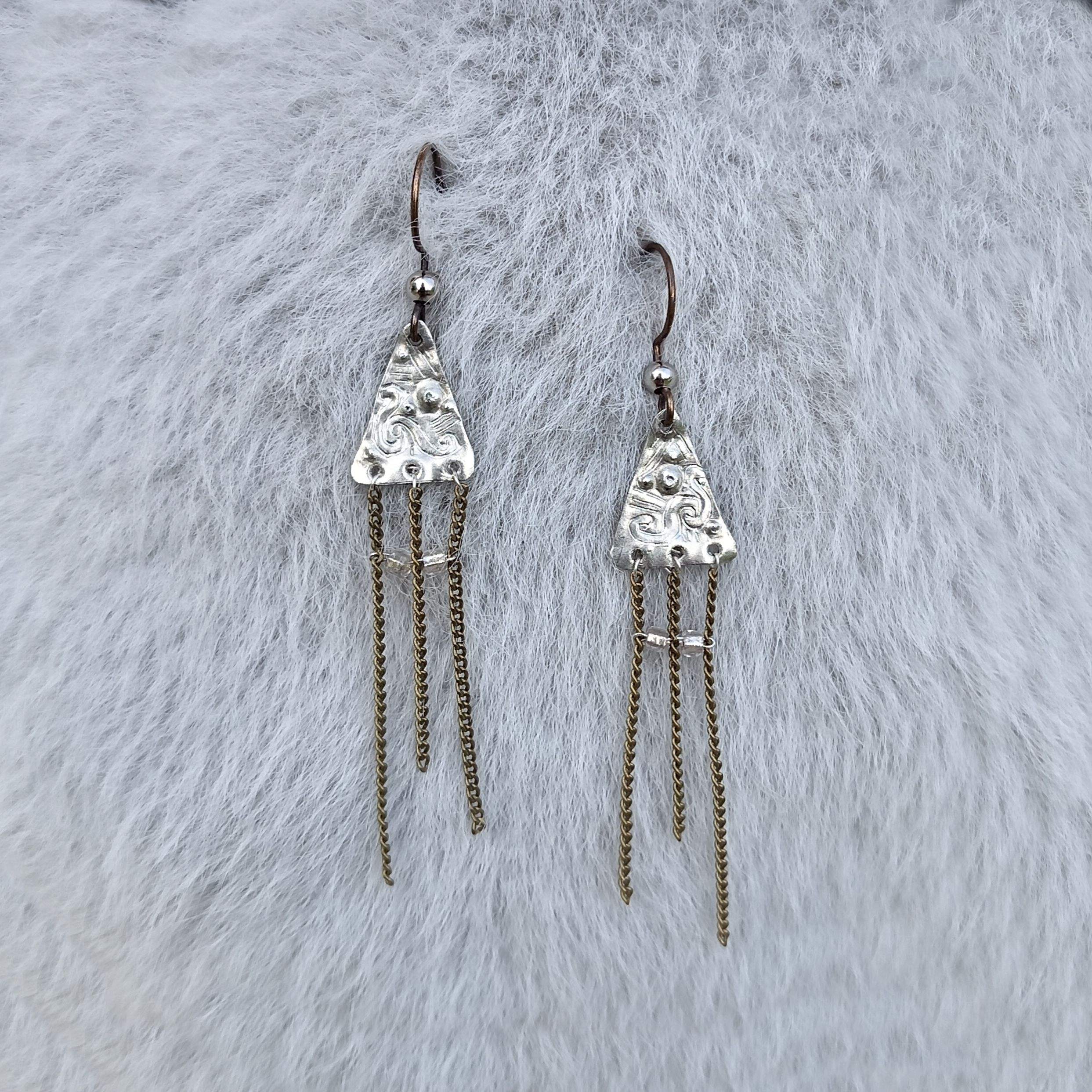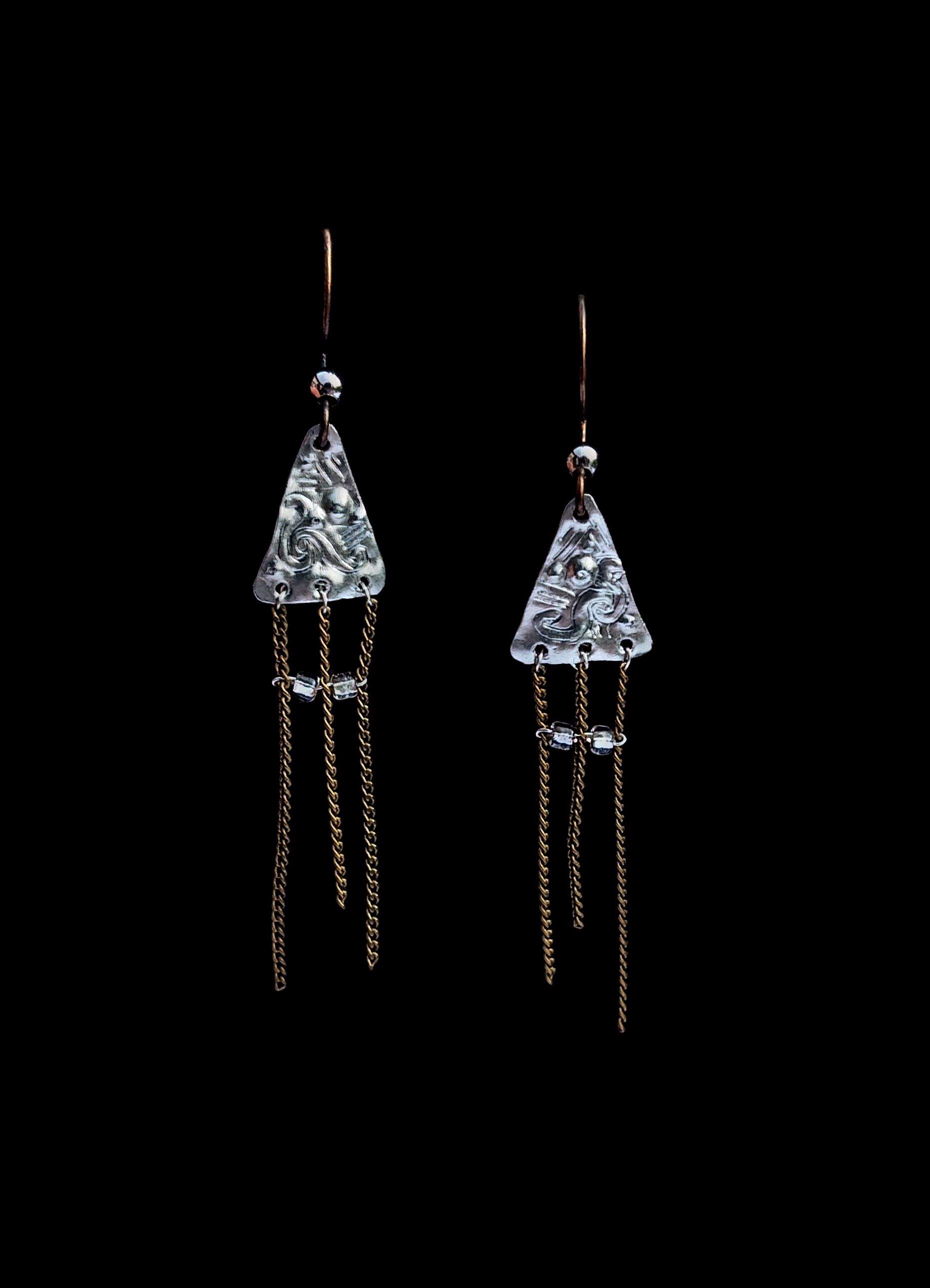Boucles d'oreilles composées de trois chaînettes en laiton vieilli, supportées par une petite feuille d'étain triangulaire, à motifs abstraits repoussés.