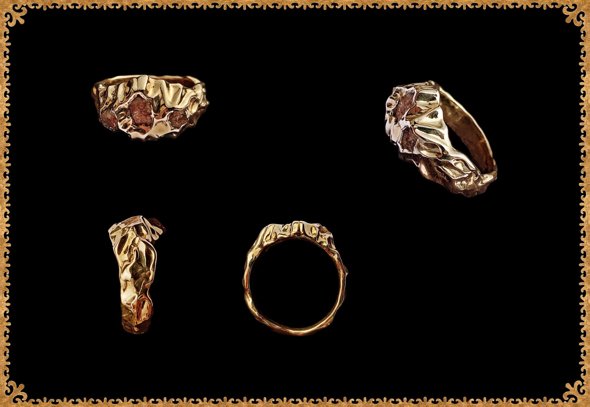 « Bague en bronze jaune incrustée de petites pierres brutes rosées (non précieuses). Le relief prononcé du métal peut suggérer les vaguelettes d'un ruisseau courant sur son lit de pierres qu'il fait scintiller.