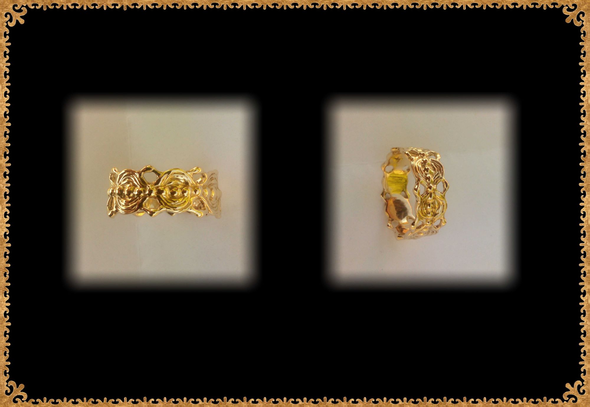 « Cet anneau en bronze jaune est formée d'un motif abstrait semi-ajouré. Les lignes arrondies dessinent comme des ondes autour du rang de petites boules.