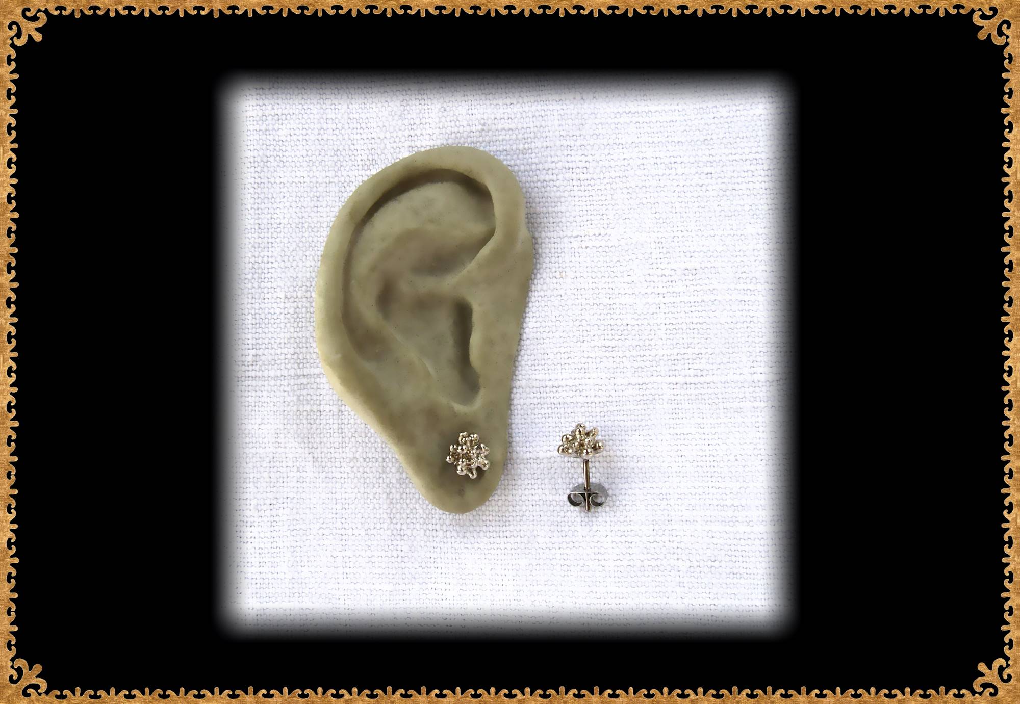 « Ces petites boucles d'oreilles en bronze blanc sont composées d'un agglomérat de billes irrégulières; cette granulation donne ainsi un effet de scintillement. »