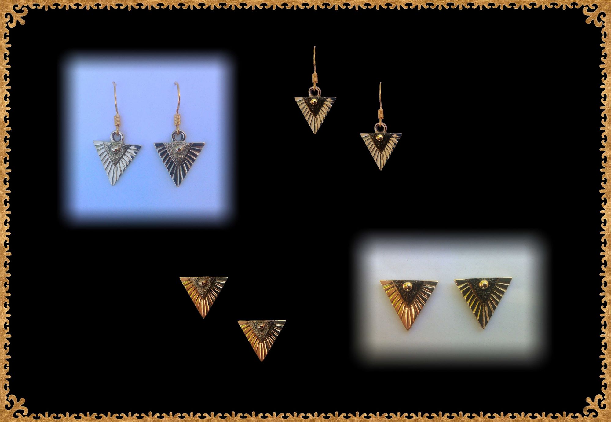 « Boucles d'oreilles triangulaires en bronze jaune, dont la partie granuleuse peut être noircie ou non selon le choix.