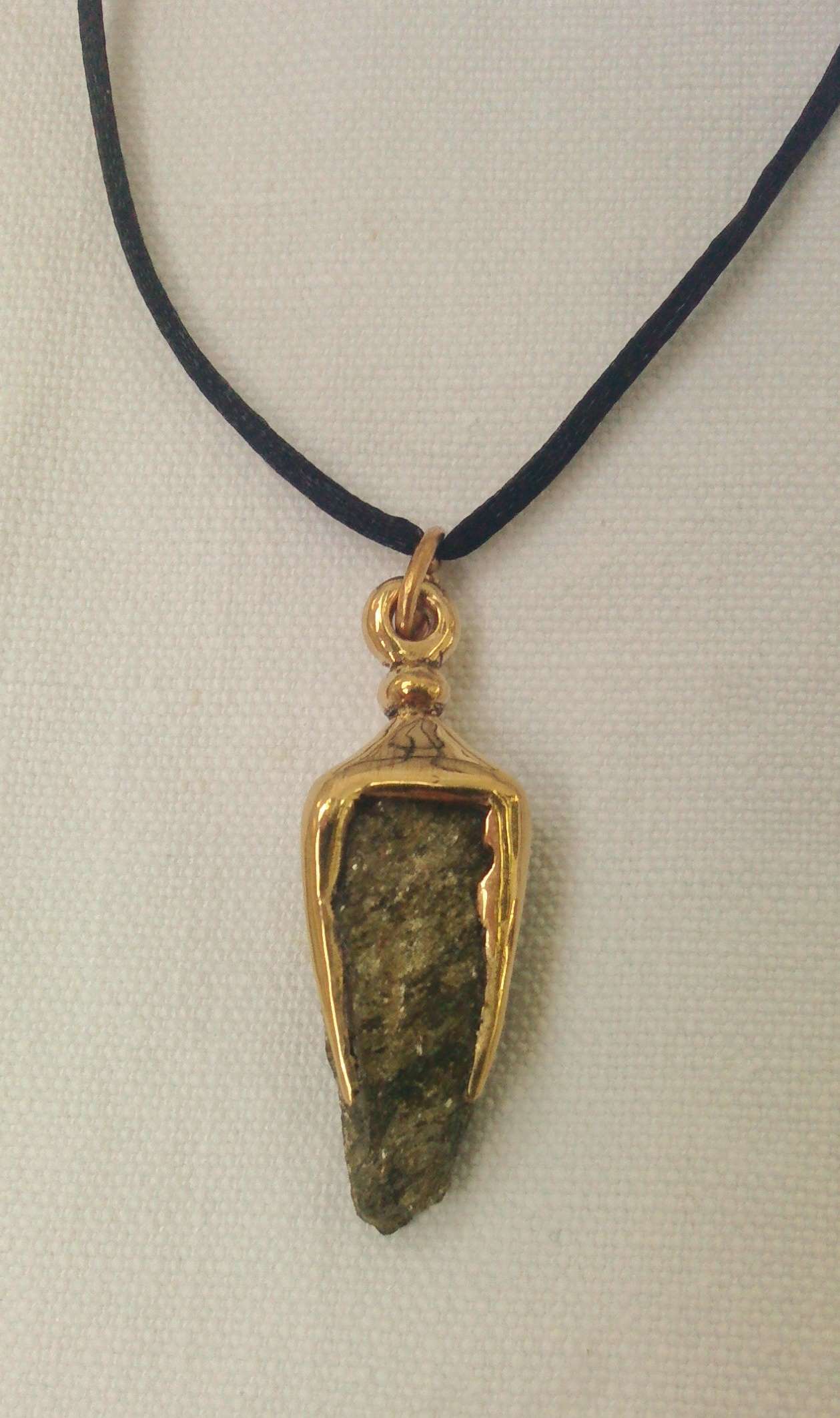 Pierre brute allongée sertie par trois pics en bronze jaune, montée sur cordon noir. Cette pierre non précieuse provient d'une rivière auvergnate, elle est grise et légèrement brillante grâce aux paillettes de mica qu'elle contient.