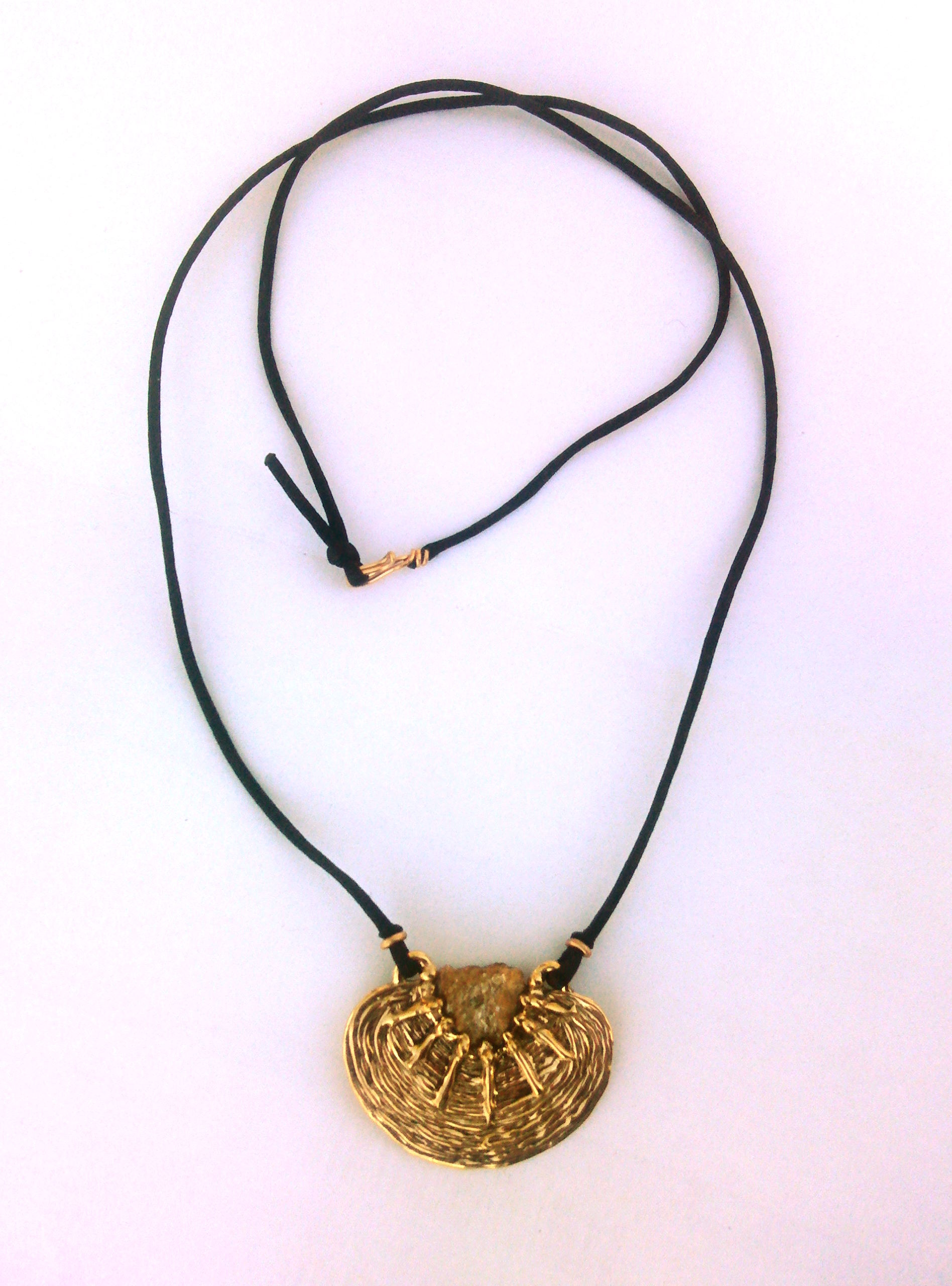 Pierre brute entourée d'un grand motif arrondi en bronze jaune, montée sur cordon noir. Cette pierre non précieuse provient d'une rivière auvergnate, elle est gris-rosé et légèrement brillante grâce aux paillettes de mica qu'elle contient.