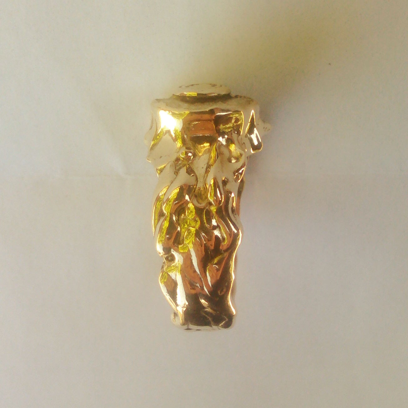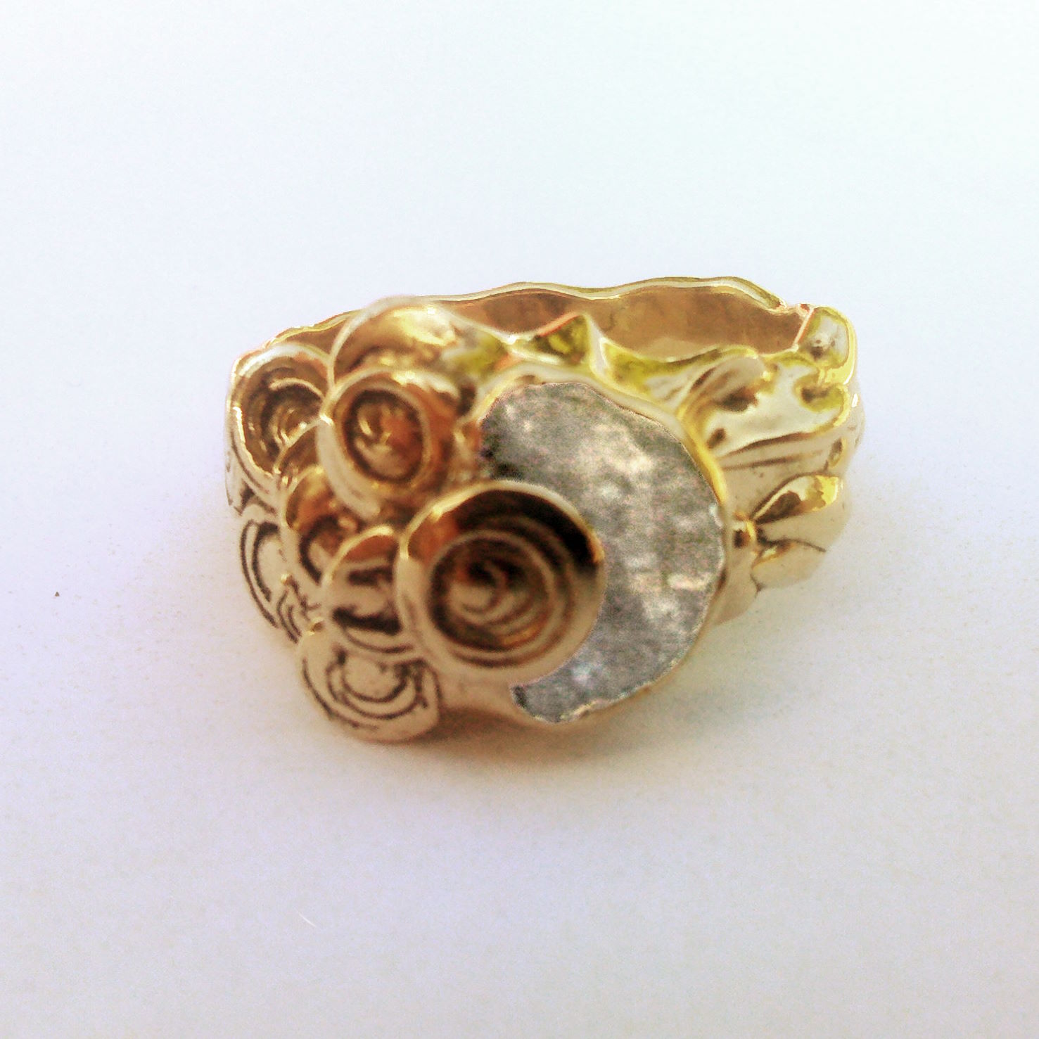 Sur cette bague en bronze jaune est sertie une pierre brute, en forme de demie-lune. La pierre (non précieuse) est blanche et légèrement brillante. Assymétrique, la bague est formée par des petits éléments ronds amassés sur un côté, tandis que le métal semble couler de l'autre côté.