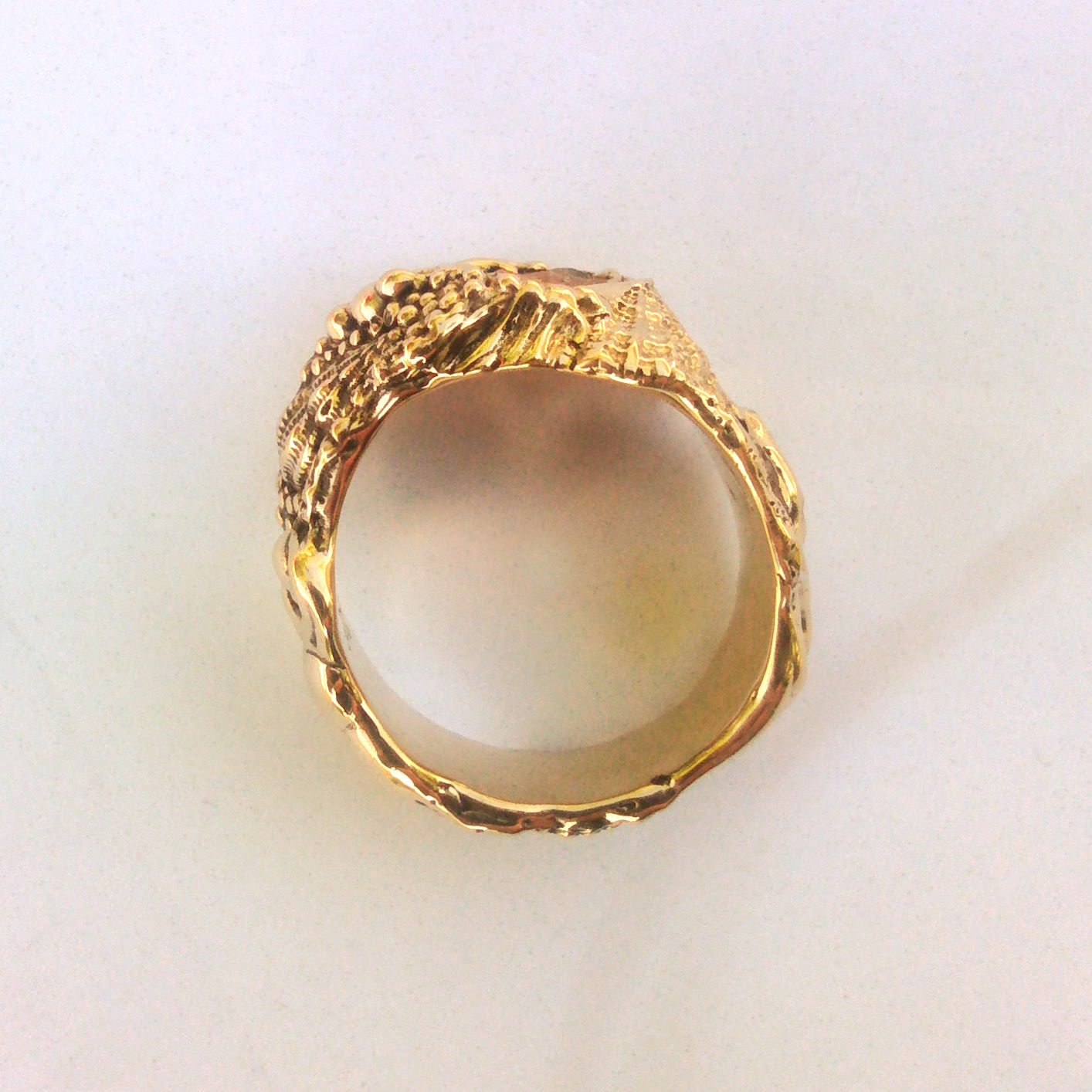 Sur cette bague en bronze jaune est sertie une pierre brute (non précieuse), couleur rouge brique légèrement brillante. Assymétrique, la bague présente de multiples motifs tels que des coquillages, billes, entrelacs, vaguelettes... Quelques petits éléments étrangers y sont également incrustés (chaînette et clou). Cette composition hétéroclite suggère des fonds marins remplis de trésors enfouis.